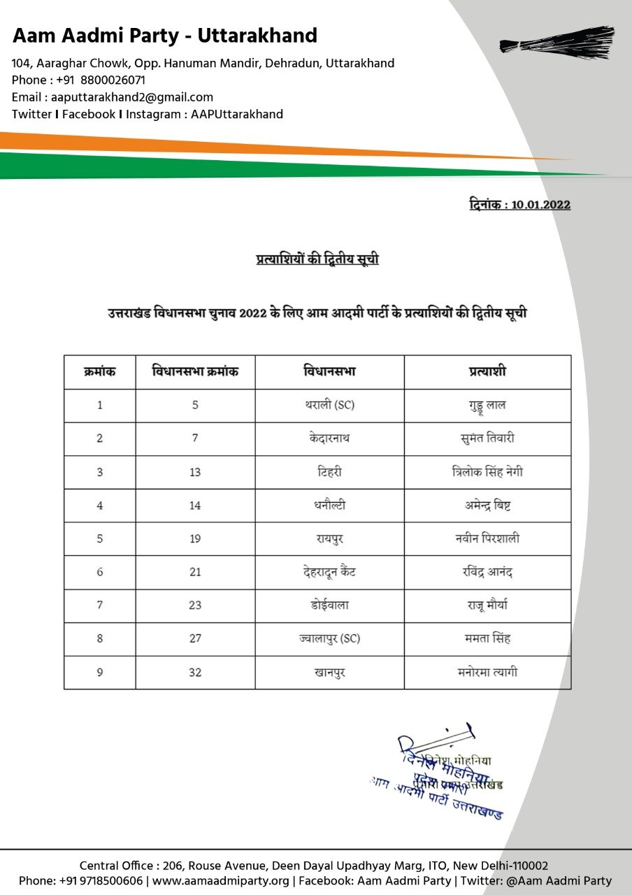उन्होंने बताया कि आप की दूसरी लिस्ट में 11 प्रत्याशी गढवाल से और सात प्रत्याशी कुंमाउ से फाईनल किए गए हैं।