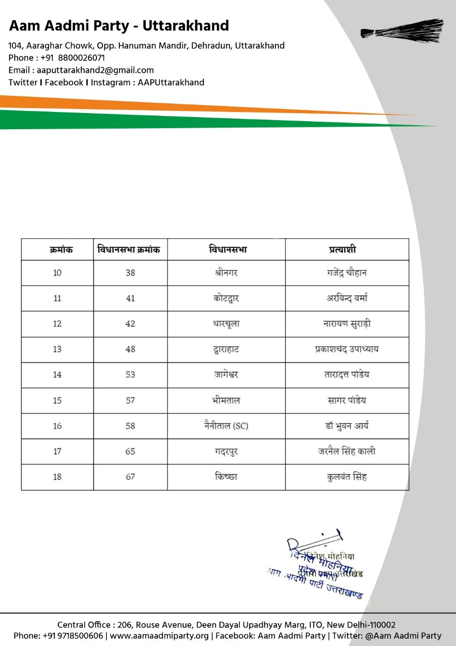 उन्होंने नाम जारी करते हुए बताया कि पार्टी ने गुड्डू लाल – थराली(एस सी),सुमंत तिवारी – केदारनाथ, अमेन्द्र बिष्ट – धनौल्टी, नवीन पिरशाली – रायपुर,रविन्द्र आनंद – देहरादून कैंट, त्रिलोक सिंह नेगी – टिहरी, राजू मौर्य – डोईवाला, ममता सिंह – ज्वालापुर(एस सी) मनोरमा त्यागी – खानपुर, गजेंद्र चौहान – श्रीनगर, अरविंद वर्मा – कोटद्वार , नारायण सुराड़ी – धारचूला,. प्रकाश चंद्र उपाध्याय – द्वाराहाट, तारा दत्त पांडेय – जागेश्वर, सागर पांडेय – भीमताल , डॉ भुवन आर्य -नैनीताल (एस सी), जरनैल सिंह काली – गदरपुर, कुलवन्त सिंह (किच्छा) से आप के प्रत्याशी बनाए।