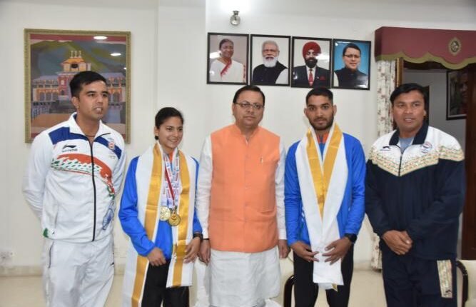 स्वर्ण पदक जीतने वाली मानसी नेगी और एथलीट सूरज पंवार ने मुख्यमंत्री पुष्कर सिंह धामी से की भेंट