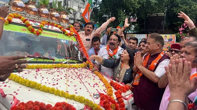 Dehradun: सैन्यधाम में अमर जवान ज्योति के लिए 21 पवित्र नदियों का जल कलशों में देहरादून लाया गया है। जल संग्रहण यात्रा के देहरादून स्थित घंटाघर पहुंचने पर सैनिक कल्याण मंत्री गणेश जोशी और भाजपा प्रदेश अध्यक्ष महेंद्र भट्ट सहित कई लोगों ने पुष्प वर्षा से भव्य स्वागत किया।