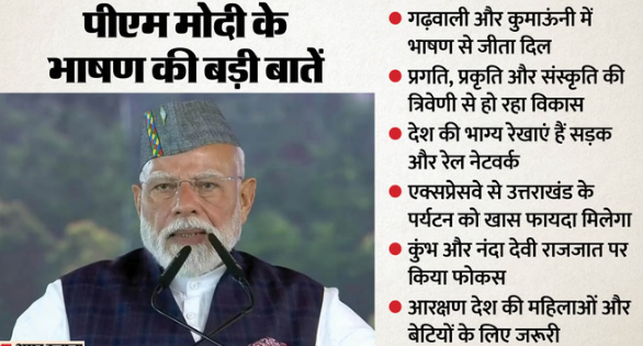 - पीएम मोदी ने अपने संबोधन की शुरुआत गढ़वाली और कुमाऊंनी में भाषण के साथ की। उन्होंने कहा कि दून पर मां डाट काली की कृपा और आशीर्वाद है। मैं उत्तराखंड से आज नई ऊर्जा और नई प्रेरणा लेकर जाऊंगा।
