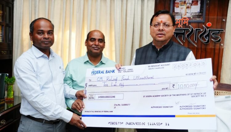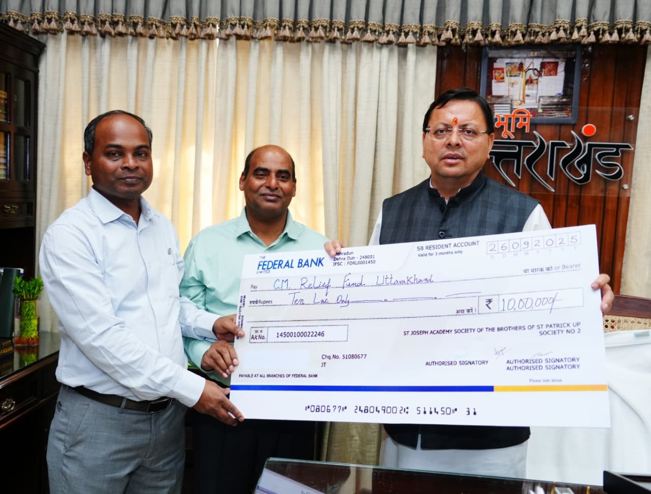 Dehradun: मुख्यमंत्री श्री पुष्कर सिंह धामी से शनिवार को मुख्यमंत्री कैंप कार्यालय में सेंट जोसेफ अकादमी, देहरादून के स्कूल प्रबंधन ने मुलाकात कर आपदा पुनर्निर्माण के कार्यों के लिए मुख्यमंत्री राहत कोष में ₹10 लाख की धनराशि प्रदान की। मुख्यमंत्री ने सेंट जोसेफ अकादमी का आभार व्यक्त करते हुए कहा कि यह योगदान आपदा प्रभावितों की सहायता एवं पुनर्निर्माण कार्यों में उपयोगी सिद्ध होगा। उन्होंने कहा कि राज्य सरकार प्रत्येक आपदा प्रभावित व्यक्ति के साथ खड़ी है। इस अवसर पर ब्रदर जोसेफ एम. जोसेफ, ब्रदर एस्टिनस कुजूर, श्री एस. के. नैथानी, श्री सचिन अग्रवाल, श्री भवनेश नेगी मौजूद रहे।